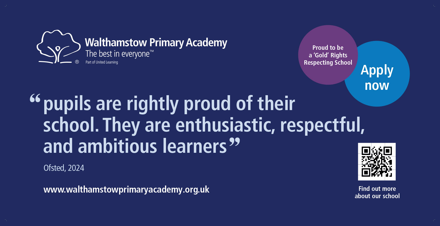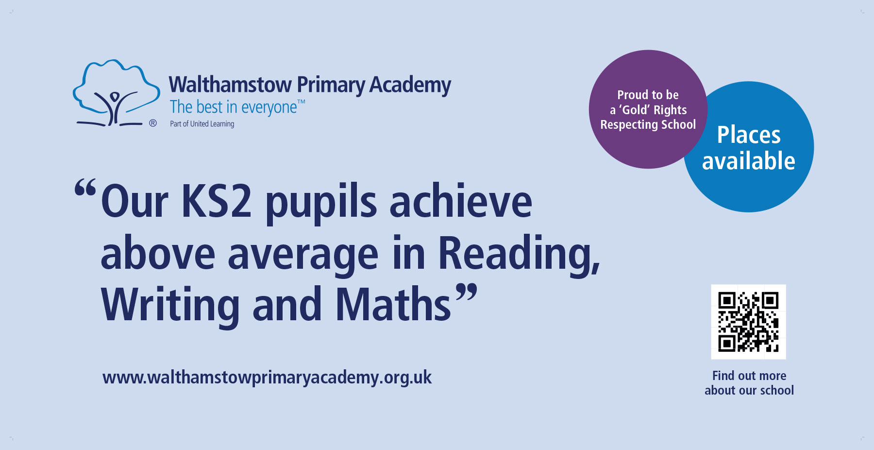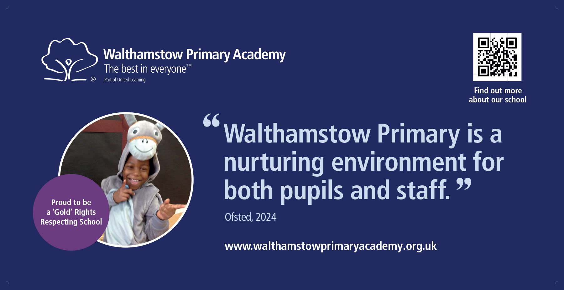 Here at Walthamstow Primary Academy our pupils benefit from consistently excellent teaching, embedded in a broad, engaging curriculum. While we have high expectations for all members of the Walthamstow Primary Academy community, we believe that we can all learn from each other, and that by learning together, we grow and succeed together.